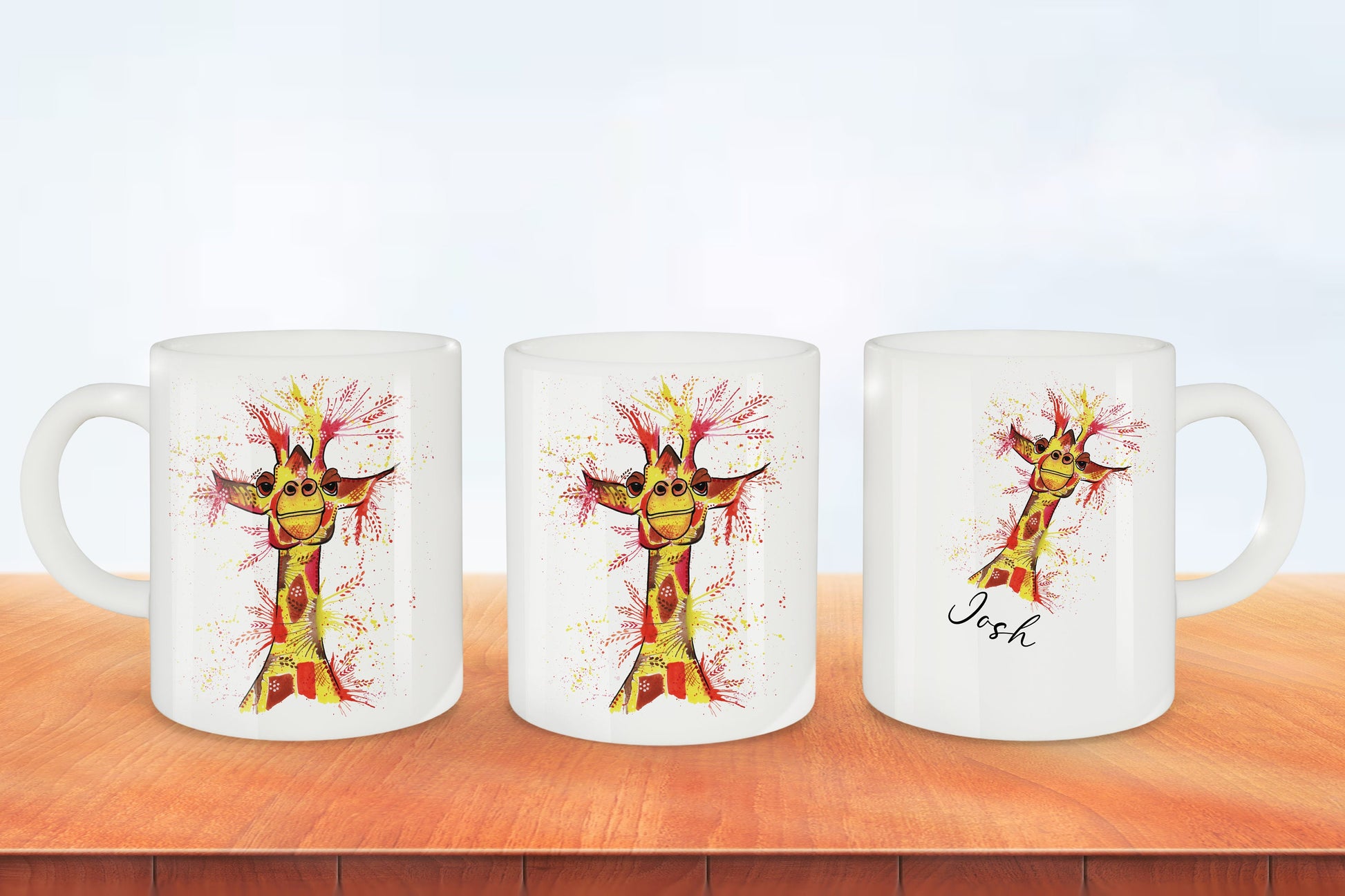 This mug is a brightly coloured yellow and red giraffe with a splatter design around it. It featured three giraffes on the mug the smaller one on the other side is placed at an angle so any personalisation can be added under it. This mug looks great on any mug with a coloured inner and handle.