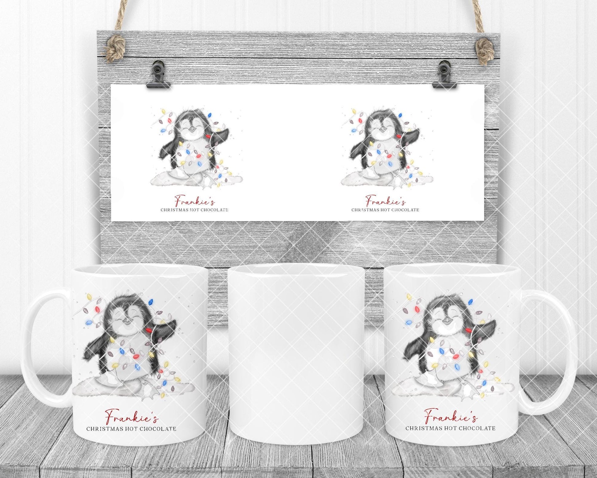 Cute penguin with multi coloured lights personalised Christmas mug gift for children adults office Hot chocolate lover gift idea