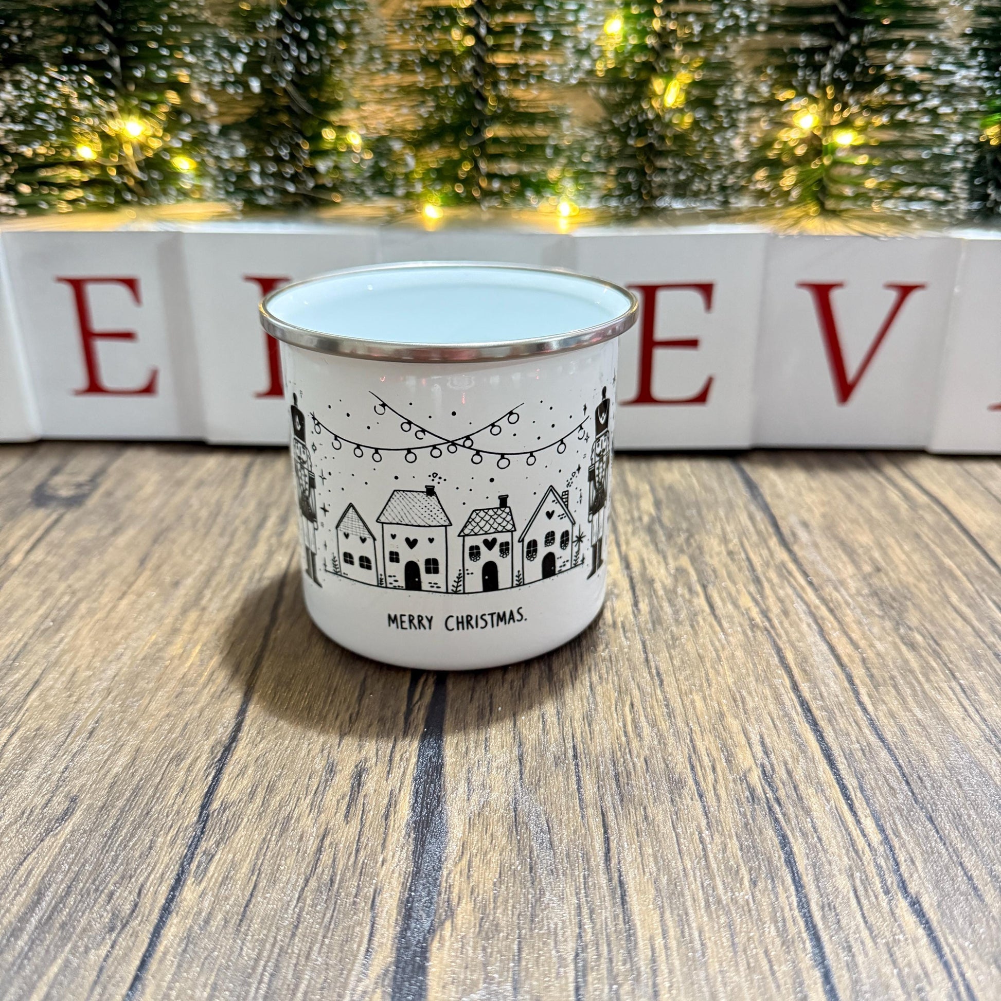 Enamel Mug Monochrome design stocking filler Christmas gift cute nutcrackers and Houses 12oz enamel mug