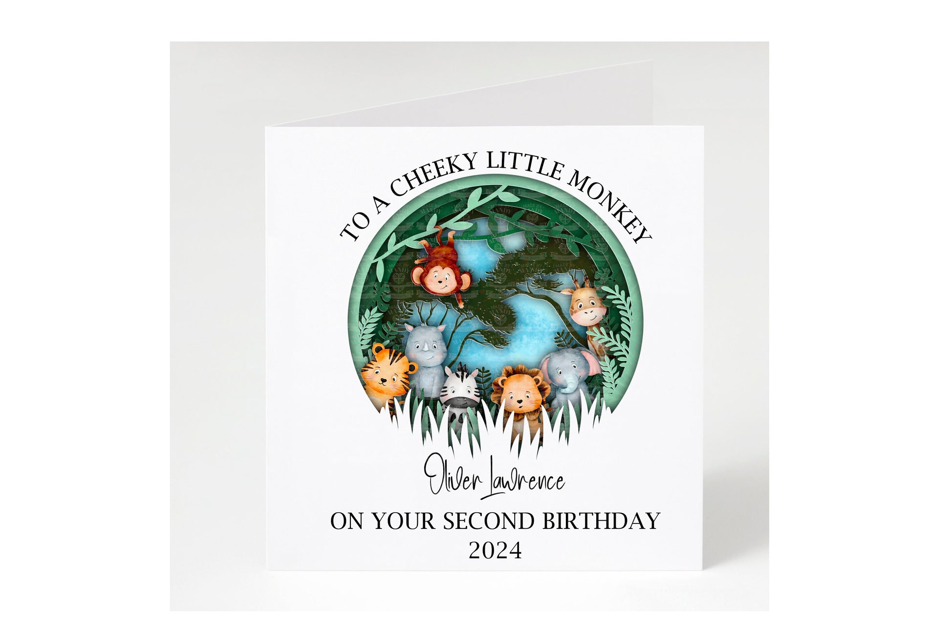 This card is Personalised for a cheeky monkey's 2nd birthday. It will also have the year 2024 so is perfect for keepsake memory box. The image is of cute jungle animals peeping out of a jungle scene.