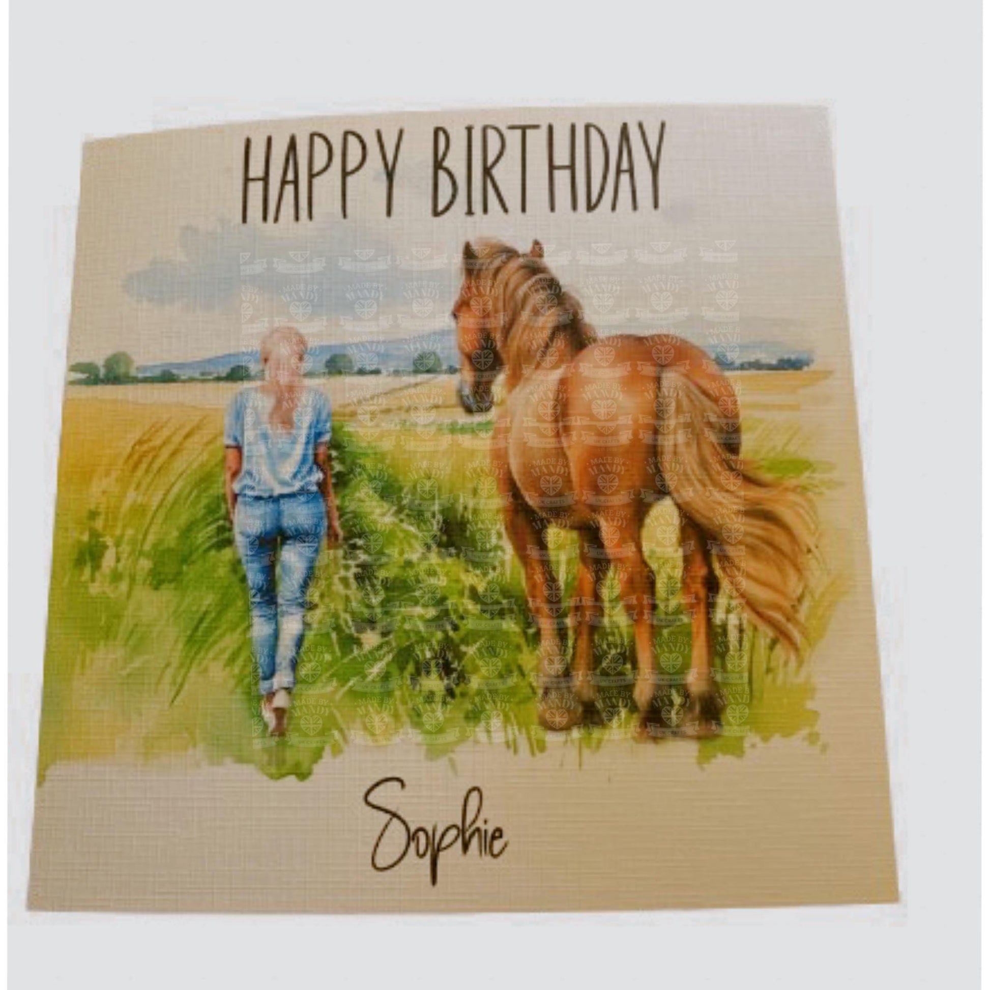 This card can be personalised with any name. The image of a blonde haired girl with a brown horse in a field is on the front of the card with Happy Birthday text at the top of the card and the personalisation at the bottom.