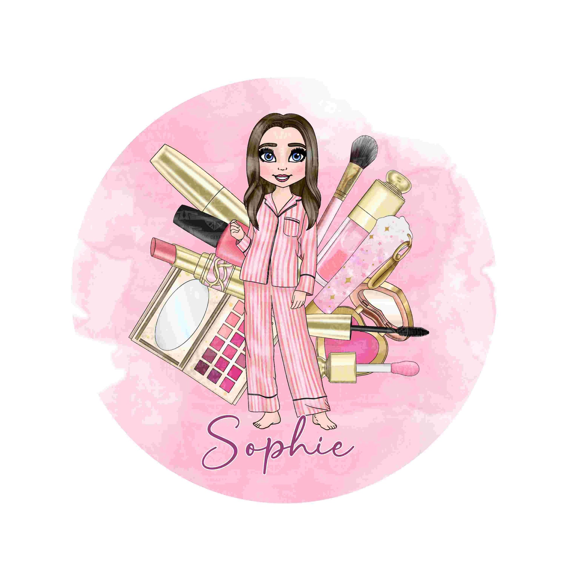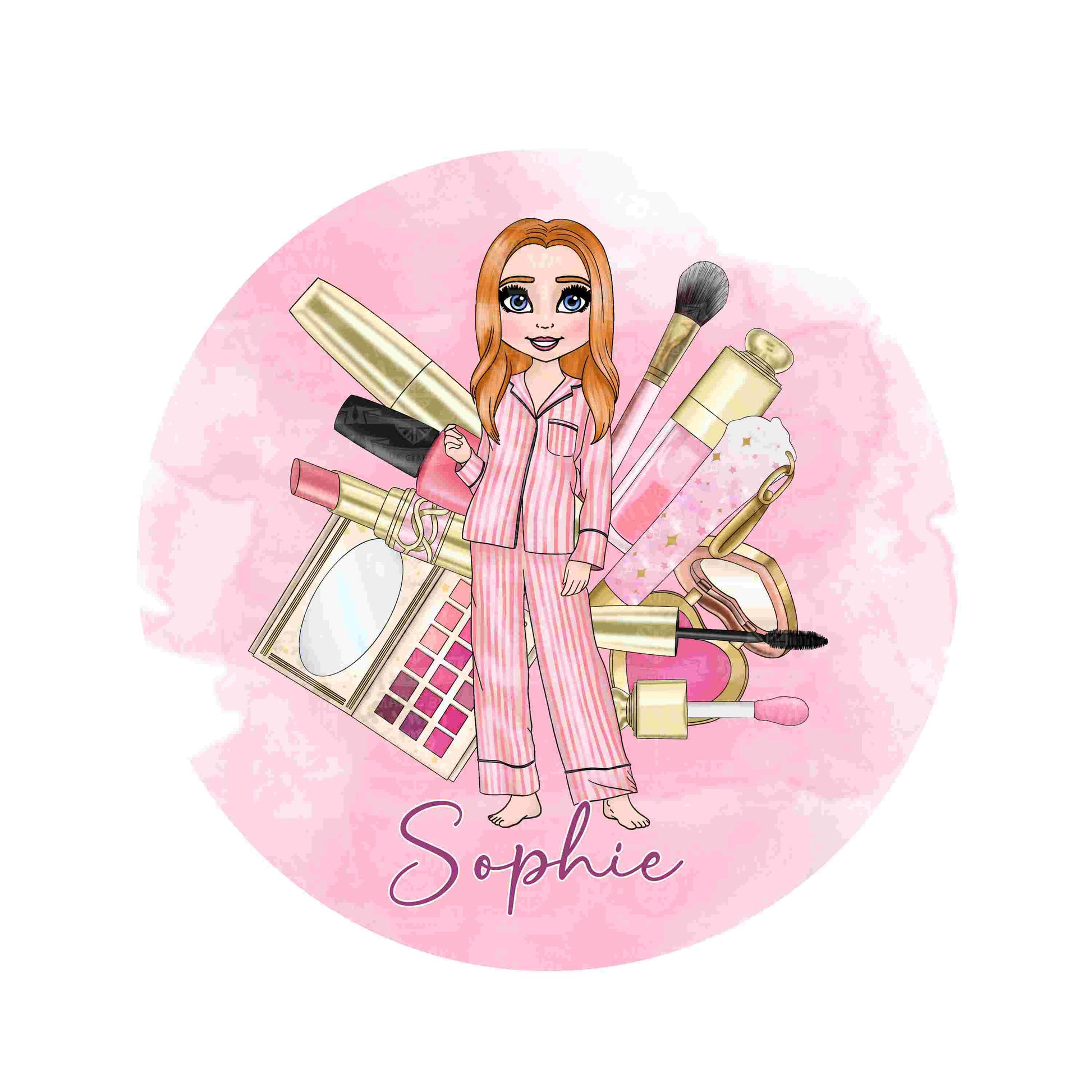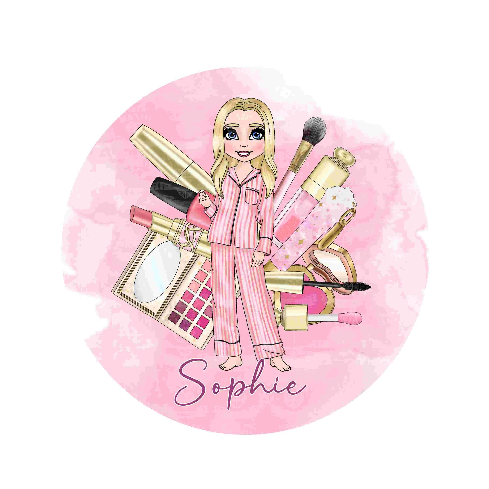 Design is a printed Girl Character wearing trendy Pink stripe pyjamas standing in front of a water coloured pink back ground with make up